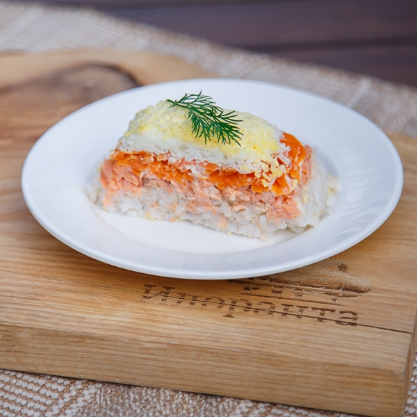 Ингредиенты салата выложены слоями, поэтому его срез выглядит красиво и аппетитно. Нежный неповторимый вкус копчёной форели идеально сочетается с рисом